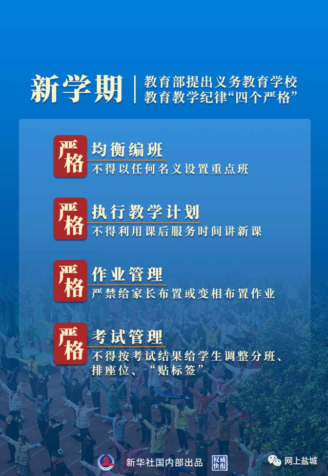 教育部基础教育司司长吕玉刚强调,新学期开学后,义务教育学校要严格执行均衡编班的法律规定,不得以任何名义设置重点班,切实做到均衡配置师资。严格执行教学计划,不得随意增减课时、改变难度、调整进度,不得利用课后服务时间讲新课。严格执行作业管理规定,严禁给家长布置或变相布置作业,严禁要求家长检查、批改作业,杜绝重复性、惩罚性作业,不得要求学生自批自改作业。严格执行考试管理规定,不得违规组织考试,考试结果不排名、不公布并以适当方式告知家长和学生,不得按考试结果给学生调整分班、排座位、“贴标签”
