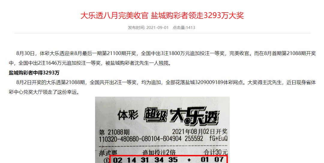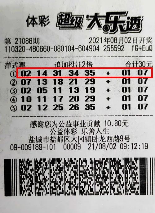 盐城购彩者领走3293万大奖!8月2日开奖的大乐透第21088期,全国共开出2注一等奖,均为追加,全部花落盐城3209009189体彩网点。大奖得主沈先生,近日现身省体彩中心兑奖大厅领走了这份幸运。仔细查看他带来的中奖票,是一张30元的2倍投注追加票。票面共有5注号码,其中第一注号码“02、14、31、34、35+01、07”,精准命中第21088期开奖号码,中得2注追加投注一等奖,每注奖金1646万多元。因为沈先生投注的这5注号码,都将后区精准锁定为“01、07”,因此还额外中得了2注八等奖和6注九等奖,单票中奖总额为32934824元。谈及购彩经历,沈先生表示,他的彩龄超过20年了。
