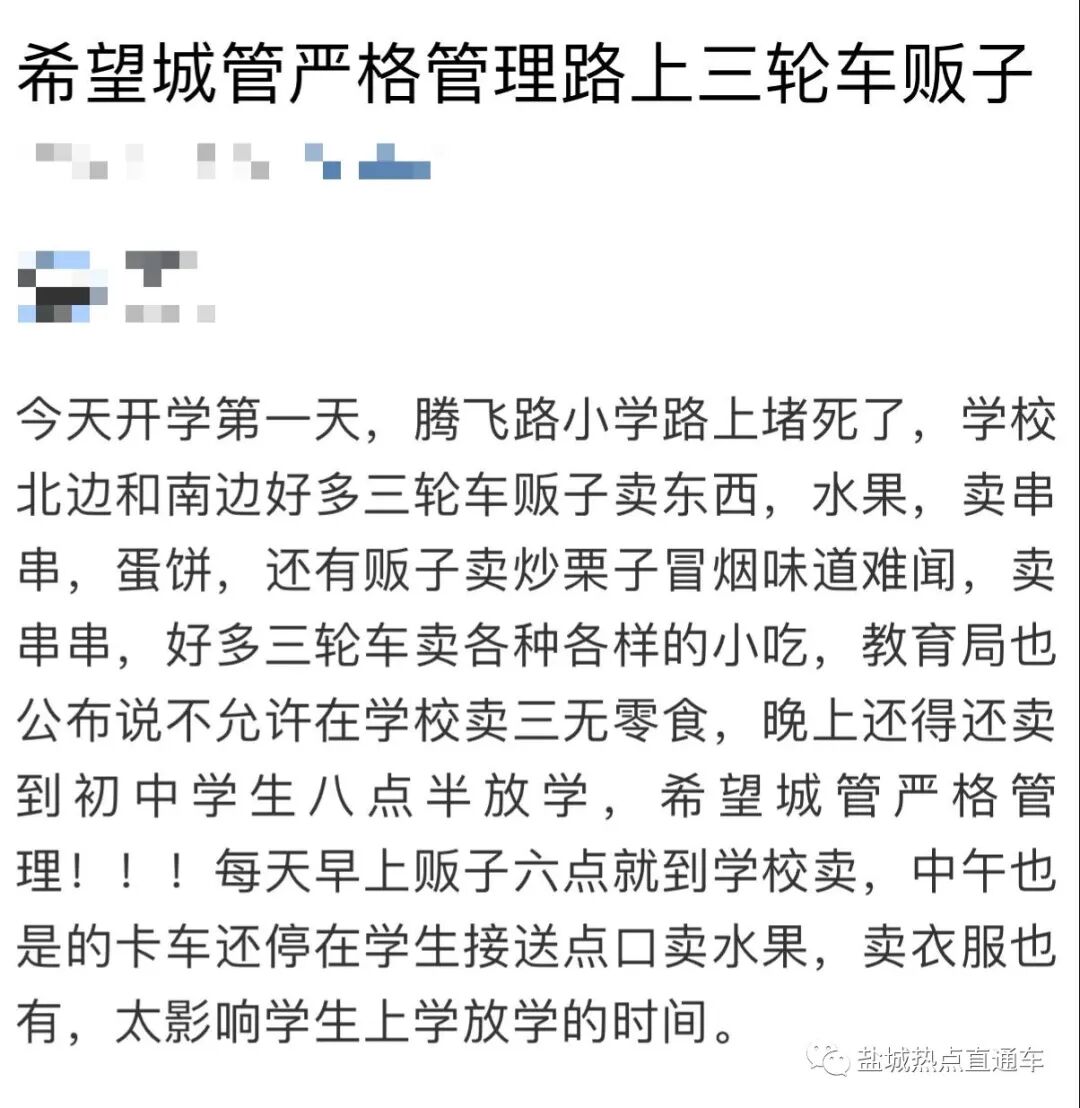 据了解,新学期刚开始,无证食品流动小摊贩设点乱摆卖爆发性出现,小摊小贩出售的食品“三无产品”对学生的健康存在较大安全隐患。希望盐都区城管部门不定期对校园周边区域进行排查,加大对食品摊贩占道经营乱摆卖违法行为的执法力度,努力为广大师生营造一个整洁、有序、安全的校园周边环境。