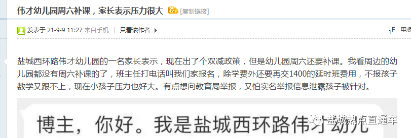 盐城西环路伟才幼儿园的一名家长表示,现在出了个双减政策,但是幼儿园周六还要补课。我看周边的幼儿园都没有周六补课的,班主任打电话叫我们家报名,除学费外还要再交1400的延时班费用,不报孩子数学又跟不上,现在小孩子压力也好大。有点想向教育局举报,又怕实名举报信息泄露孩子被针对。