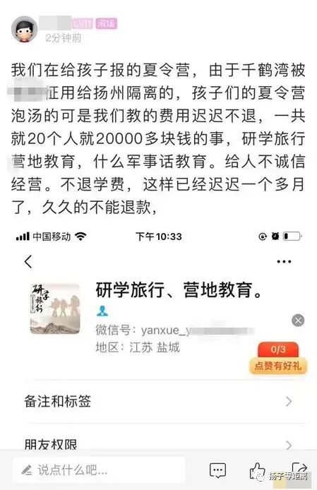 暑假给孩子在研学旅行营地教育报名去参加夏令营,由于疫情千鹤湾征用给扬州隔离的住了,孩子们的夏令营取消了,可是我们可交到钱迟迟不退。一共就20个人就20000多块钱的事,这样已经有一个多月了。