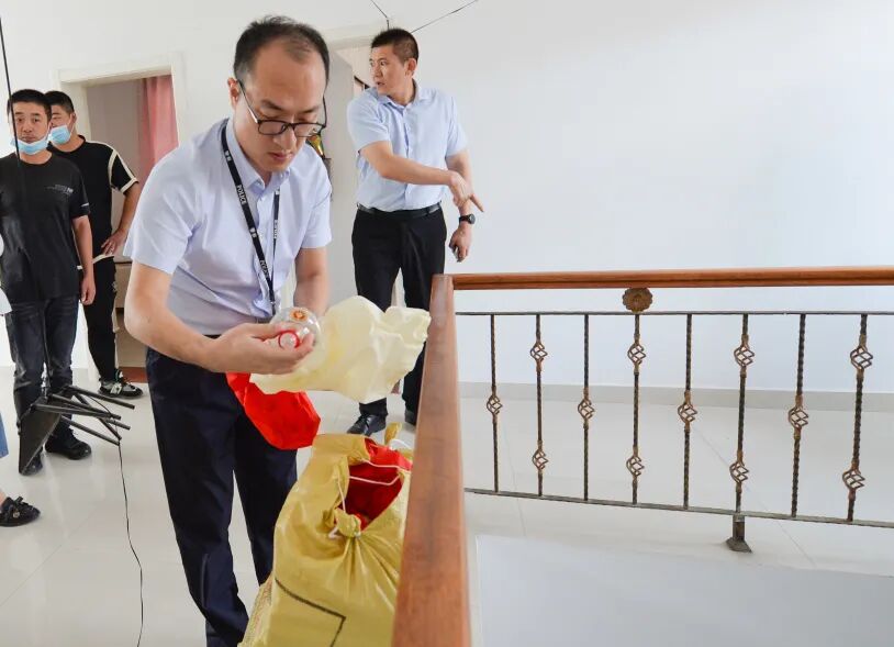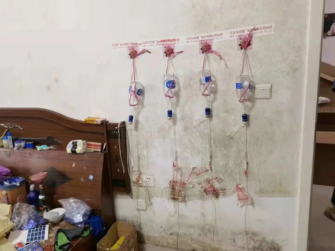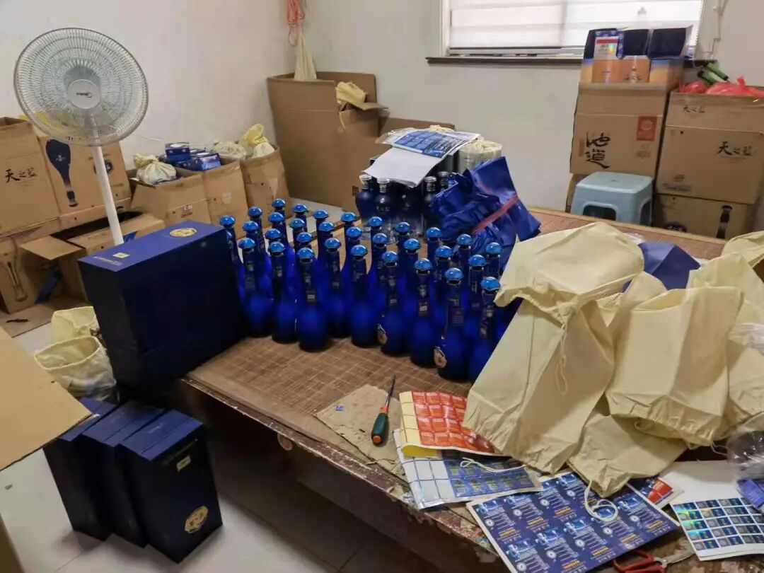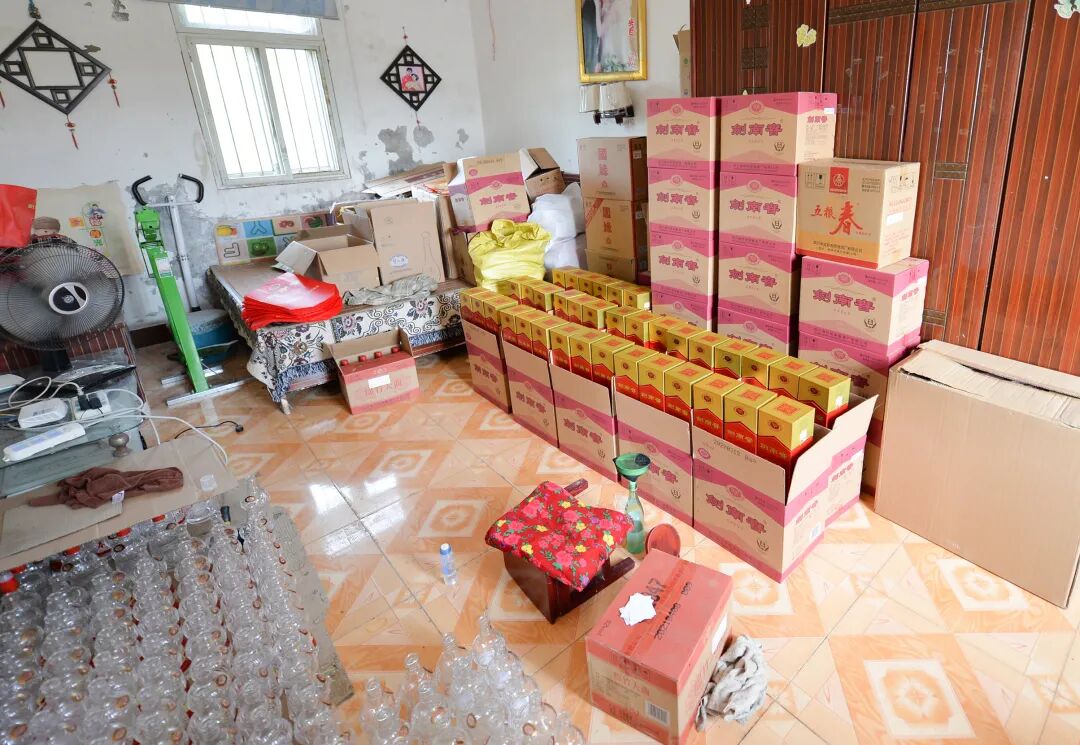 出租屋的客厅里摆放着洋河蓝优和洋河普曲20多箱,房间的床上整齐地排着几十瓶刚刚制好的假酒,四周摆放着标签、瓶盖和包装盒等配套材料,楼上的蛇皮口袋里装着天之蓝、梦6、梦3等空瓶。