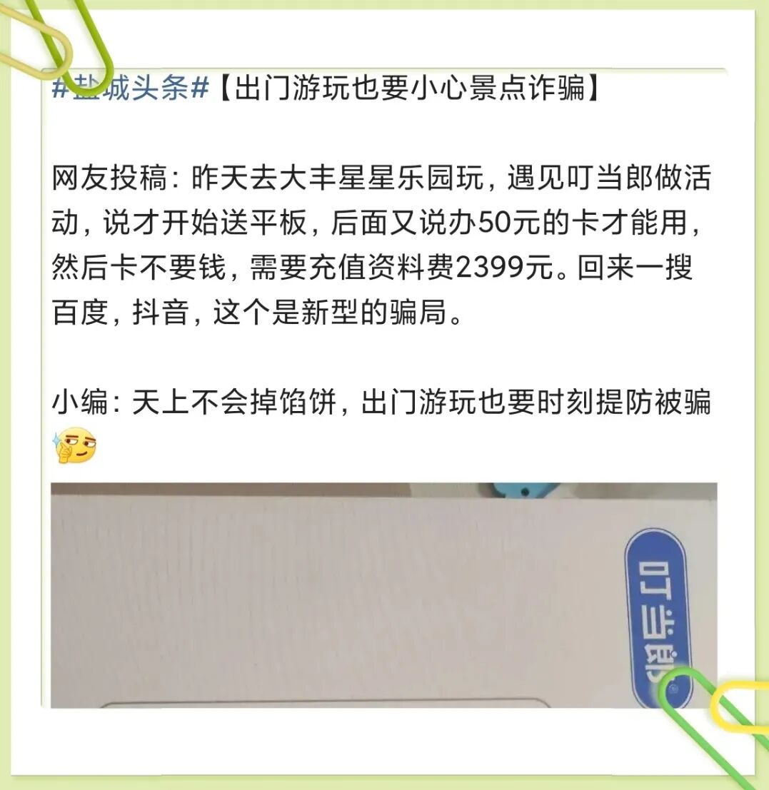 市民去大丰星星乐园玩,遇见叮当郎做活动,说才开始送平板,后面又说办50元的卡才能用,然后卡不要钱,需要充值资料费2399元。回来一搜百度,抖音,这个是新型的骗局...