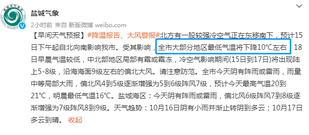 ,冷空气影响期间(15日到17日)将出现陆上6-8级,沿海海面9-10级的偏北大风。请注意防范。