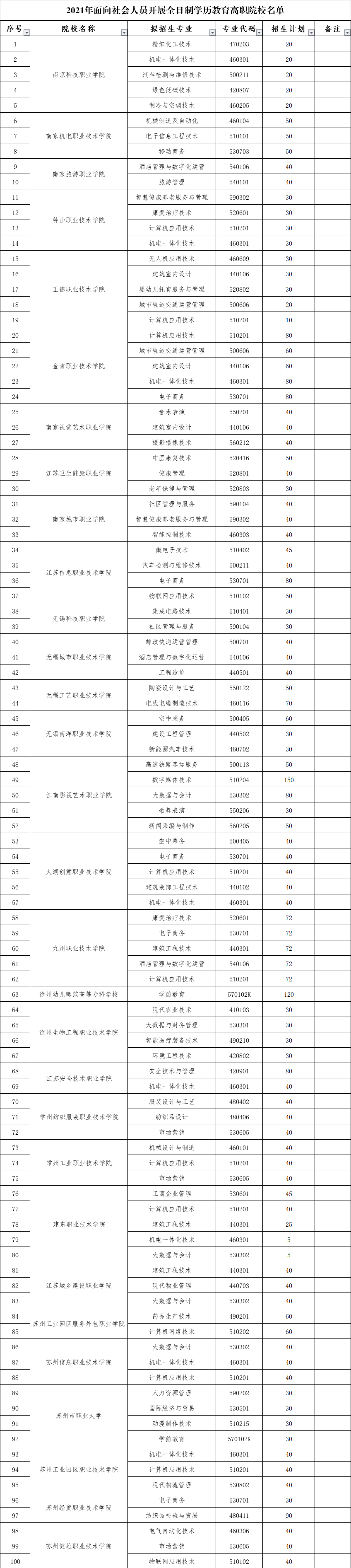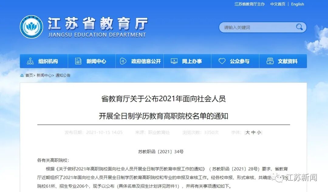 记者10月15日从江苏省教育厅了解到,根据相关文件要求,省教育厅近期组织了2021年面向社会人员开展全日制学历教育高职院校和专业的申报及审核工作。经各校申报、形式审核,共确定参与招生院校61所、招生专业206个,现予以公布,并将有关事项通知如下。