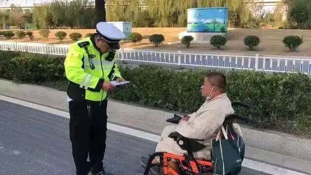 18日下午16时,交警快速路大队视频巡查发现范公路高架五星枢纽北侧有一辆残疾轮椅车在行驶,随即指令附近巡逻车前往处置,经查该男子37岁,盐城永宁寺僧人,腿部伤残,18日下午乘坐高铁出站后驾驶电动轮椅车误入范公高架,民警迅速将该男子护送离开高架至安全区域,并进行交通安全教育。