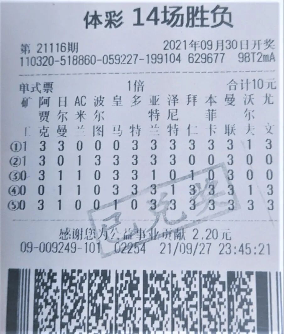据悉,丁先生也是征战足彩多年,是个地道的老玩家,曾经也斩获过足彩大奖,他的足彩投注方式有别与传统的复式投注,喜欢用单式出击,不过这也不妨碍他中奖。胜负彩21116期由欧洲冠军联赛小组赛组成,14场比赛仅有3场主负,其中皇马主场1-2不敌谢里夫爆出当期最大冷门,AC米兰主场1-2不敌马竞、波尔图主场1-5惨败于利物浦也实属正常。倒是本菲卡主场3-0巴萨,尤文主场1-0切尔西还称得上属于小冷的主胜场,仅有的两场平局沃尔夫斯堡1-1塞维利亚、矿工与国米互交白卷波澜不惊。