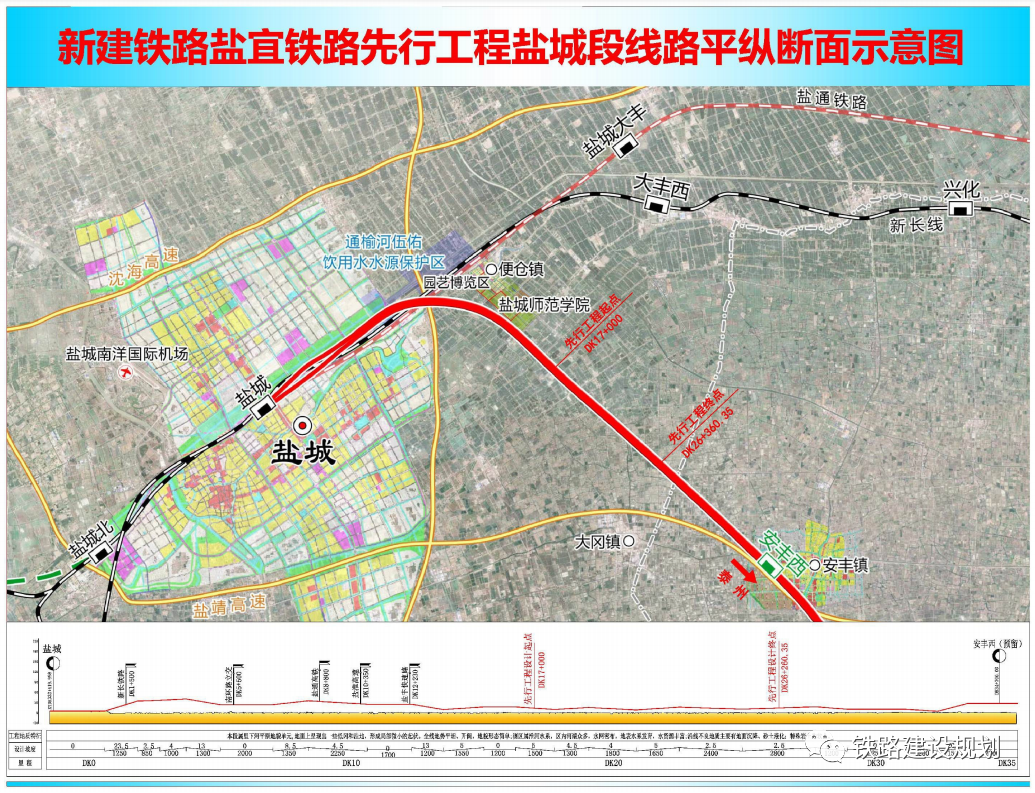 先行工程盐城段起讫里程为DK17+000~DK26+360.35,线路正线长度9.36km。其中4.893km位于亭湖区便仓镇,4.467km位于盐都区大冈镇,均为直线段区间桥梁,桥面宽度12.6m,无砟轨道双线5.0m线间距。